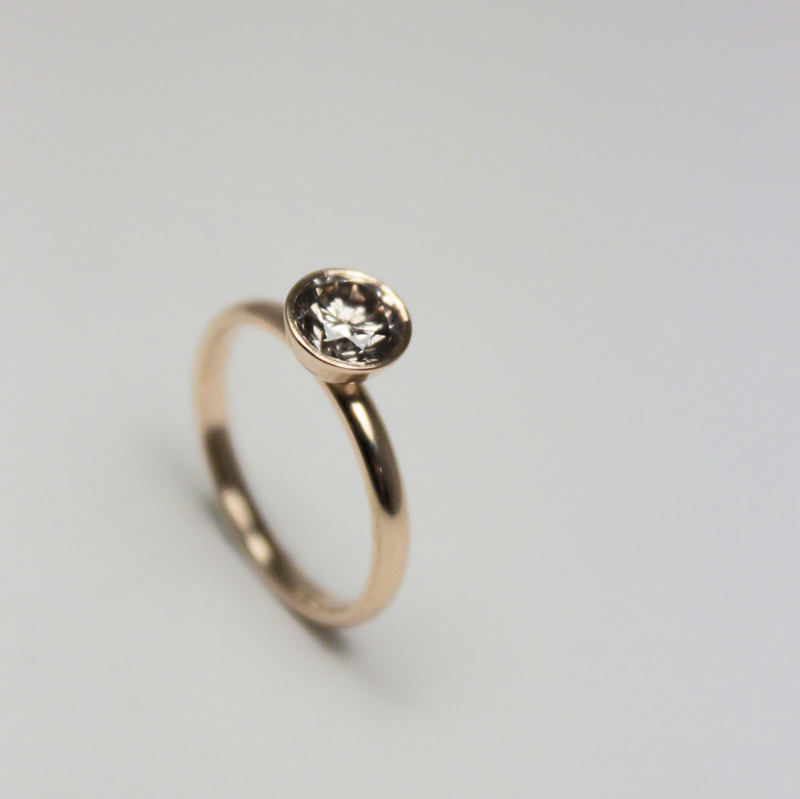 Det blev en kaffefärgad diamant som går ton i ton med 18K rödguldet som är i ringskenan. Det tycker jag är ett känsligt och mjukt sätt att hantera ädelmetallen och brilliantslipningen. Det mjuka och gyllene visade sig passa hennes färger perfekt. Ringarna som hon hade sedan tidigare är mycket kraftfulla men helt utan stenar. Därför skulle den här guldringen bara handla om diamanten. En ring till en drottning.